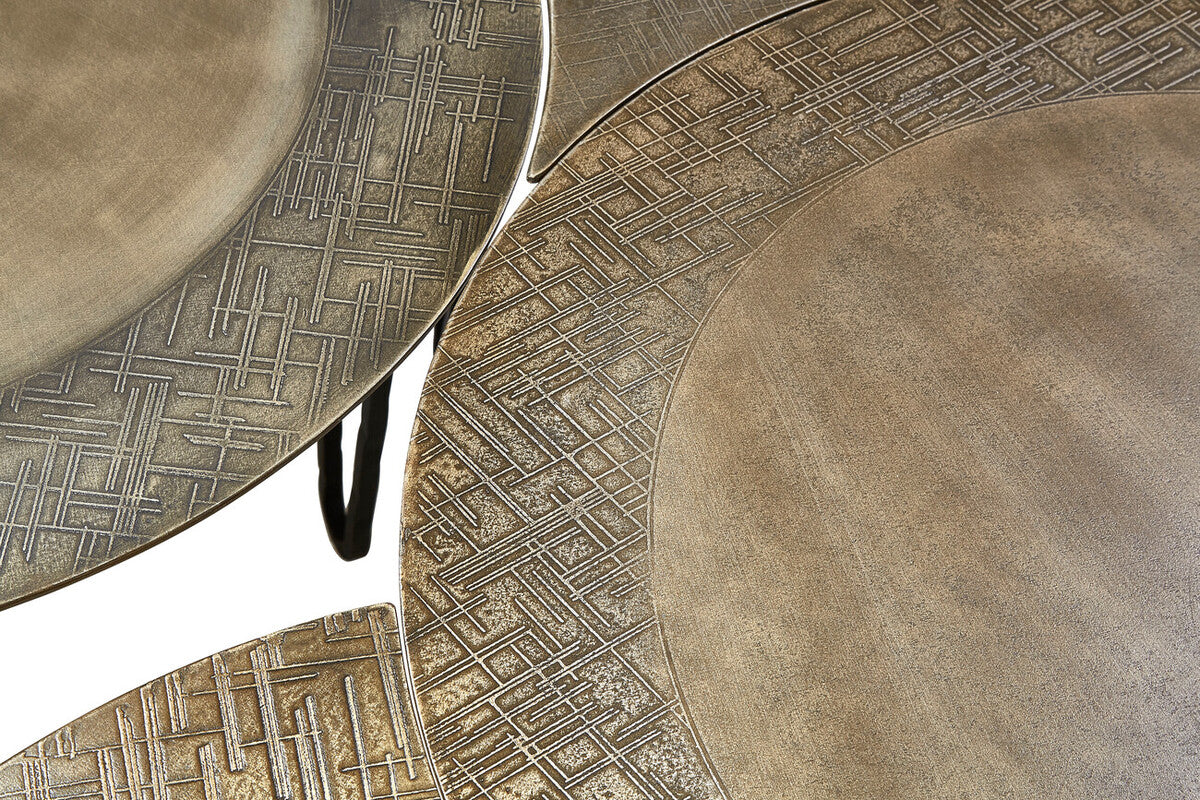 Design your layout your way with the Rany Set Of 4 Coffee Tables. This versatile quartet includes two circular tables, one crescent partner, and one teardrop companion, all finished in a warm antique brass tone with subtle linear scoring along the outer rims.