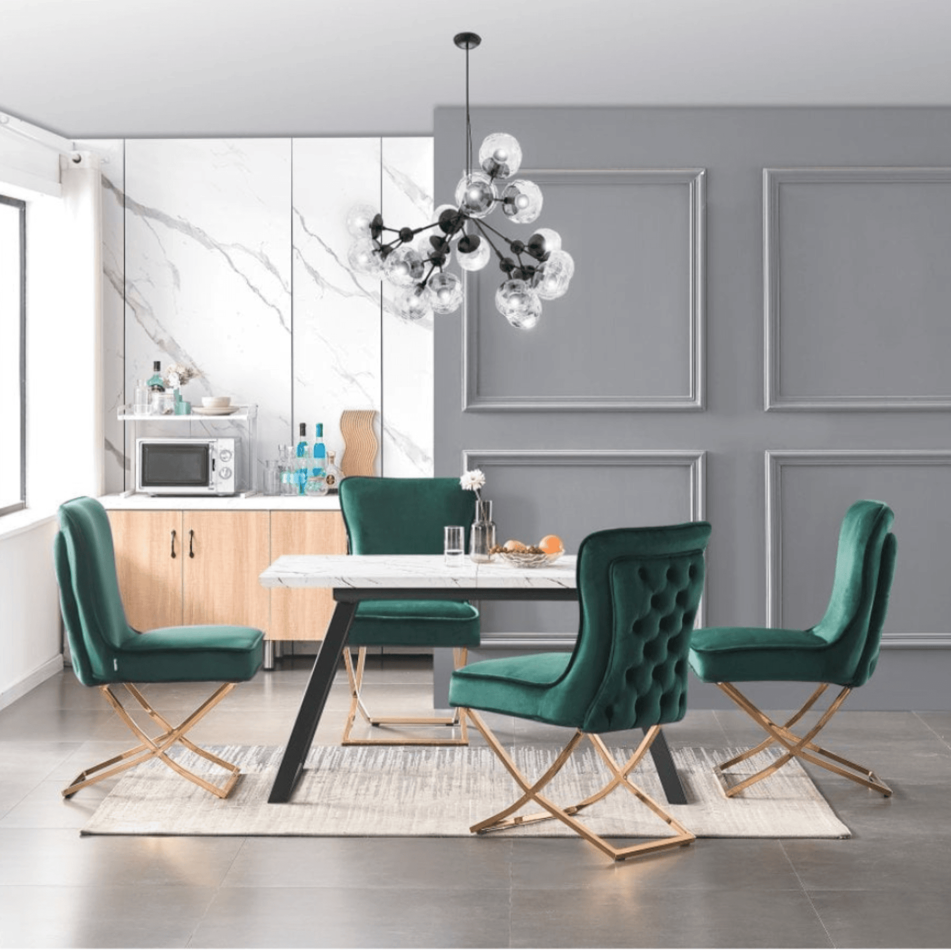 Make a statement in your kitchen, dining room or bedroom. Upholstered in a plush polyester velvet and a high quality density foam and fiber seat ensuring comfort levels are premium. Evoking a modern contemporary aesthetic. Supported with contrasting legs and floor protectors to protect you from those little wobble-wobbles! Sleek, stylish and chic with the added oomph!