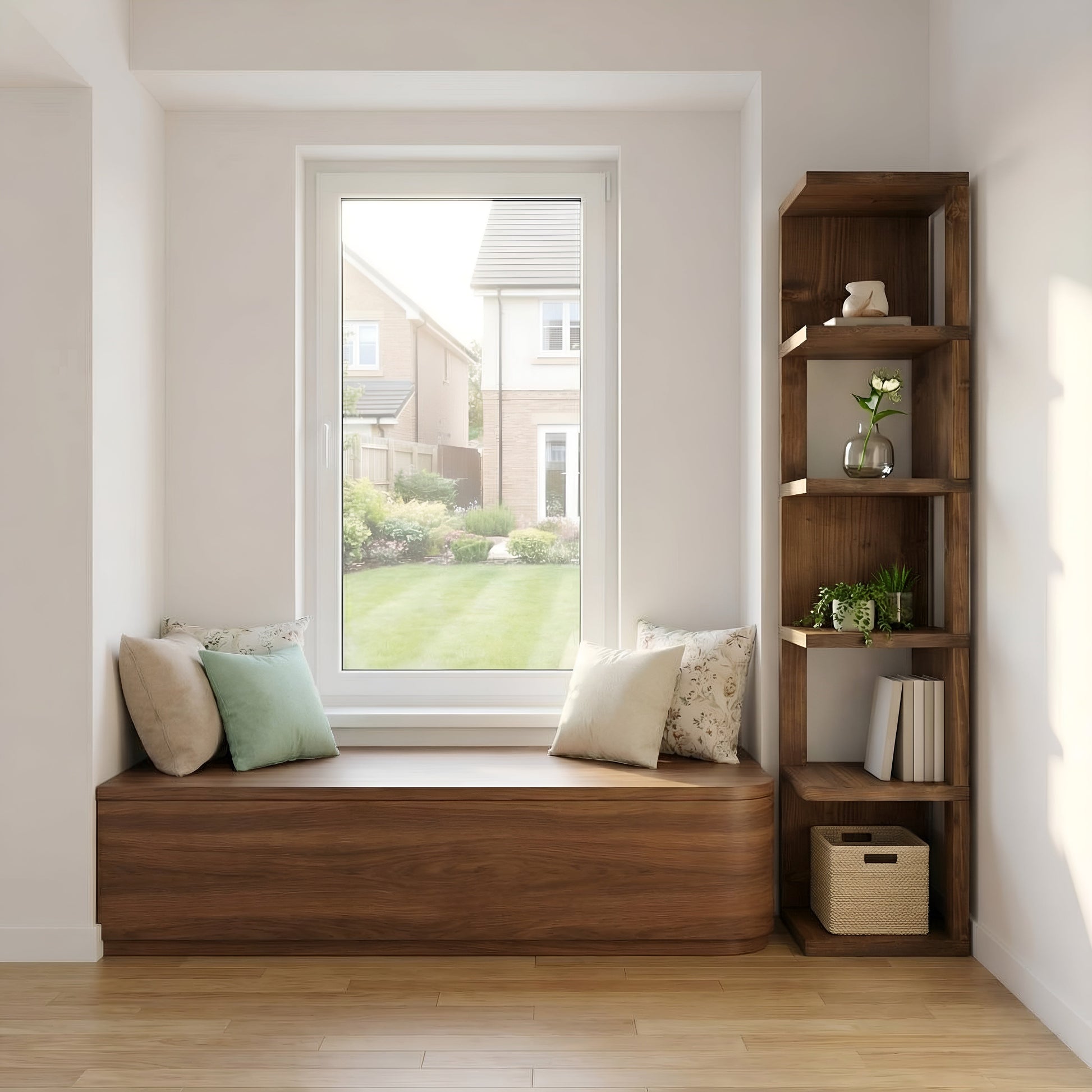 A beautifully handcrafted solid-wood corner bookshelf, designed to fit neatly into any 90-degree corner while adding warmth, charm, and practical storage to your space. Each open cube compartment measures 28 cm (H) x 28 cm (W) x 28 cm (D) — perfect for books, décor, baskets, or decorative storage.