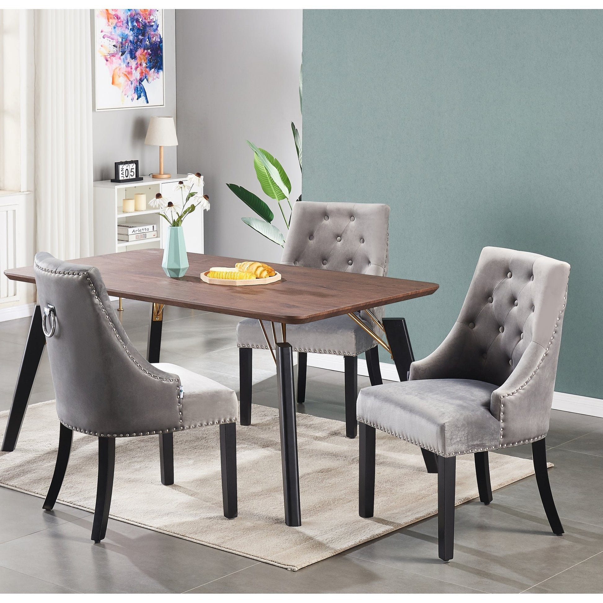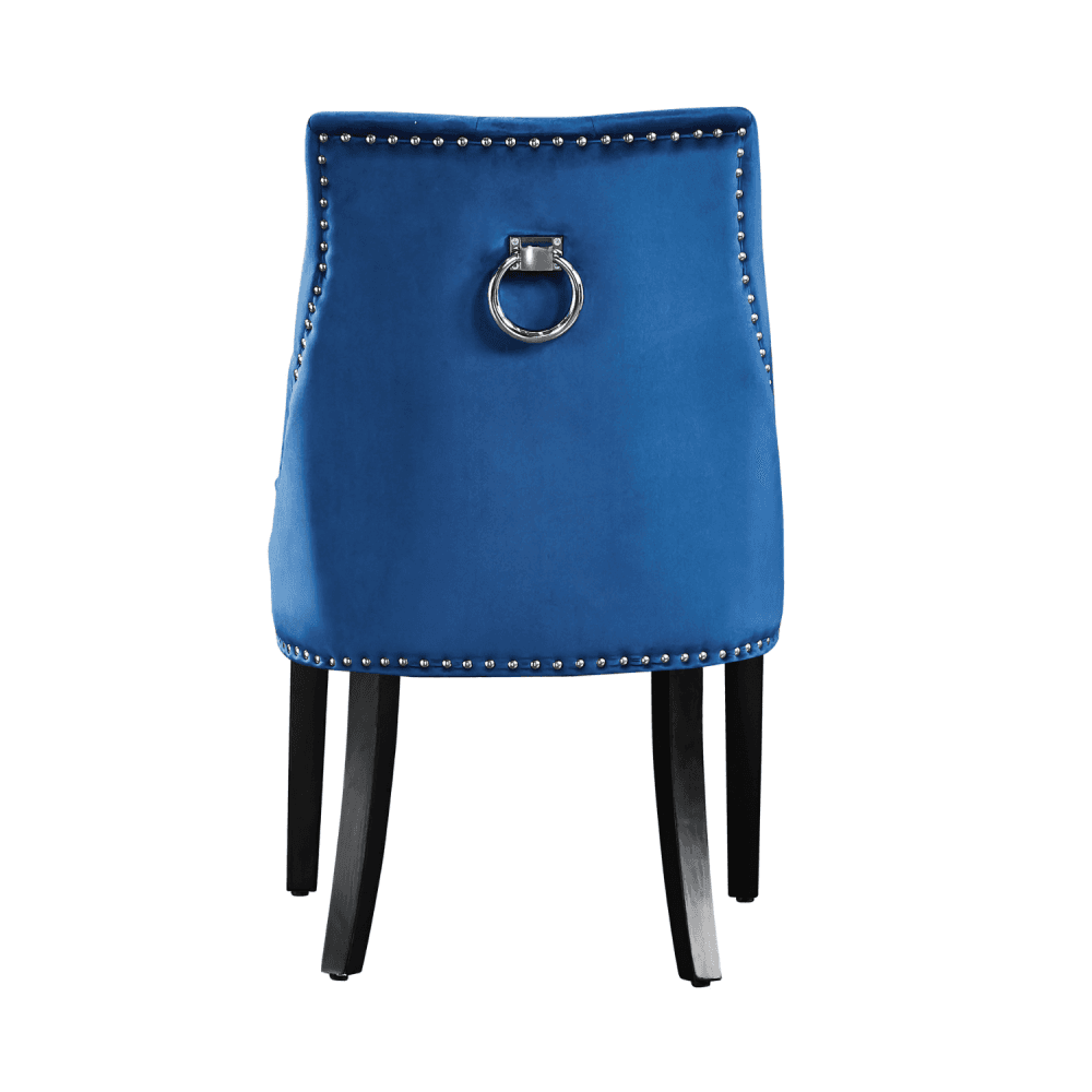 Comes with a Set of 4 Windsor Dining chairs featuring an artful combination of designer curves, sweeping arches, and soft edges, creating a visually striking and inviting silhouette. The meticulous craftsmanship extends to the intricate diamond tufting, metal stud work, and the stunning knocker handle on the rear, which adds an extra touch of sophistication. Sink into the sumptuousness of high-grade fabric (Velvet upholstery) weaves that not only exude a natural feel but are also effortlessly easy to clean. The foam filling offers a delightful seating experience, while the ergonomic backrest conforms to your body, ensuring unparalleled support during those delightful and extended dinner gatherings.